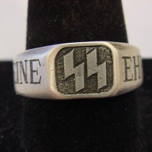 SS officer silver ring. Ring is a custom period jeweler commissioned piece for an SS officer. Ring is hand engraved with SS runes to the front and MEINE EHRE ! to the sides. The silver ring has a content hallmark to the outside of the band. Size 13.  FINE+ condition.